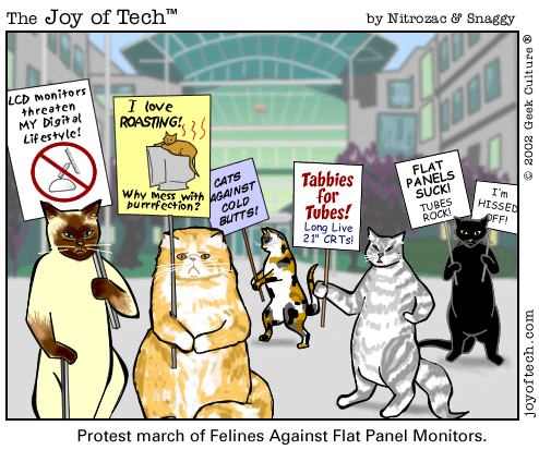 - Cats, unable to soak in heat from CRT monitors, will soak in heat from other sources, thereby causing an ice age.